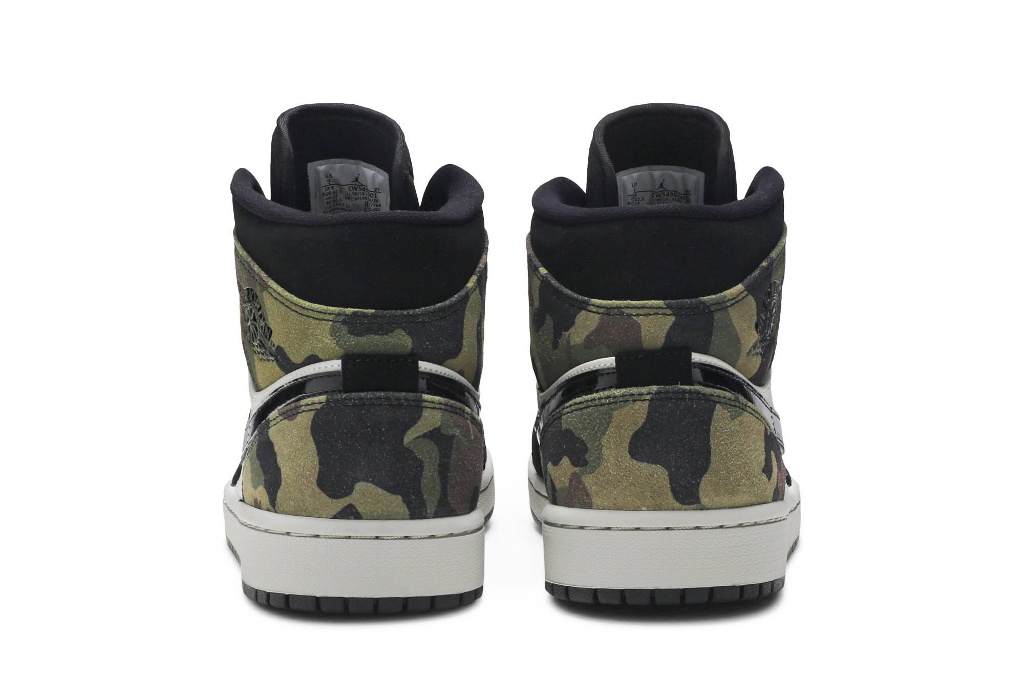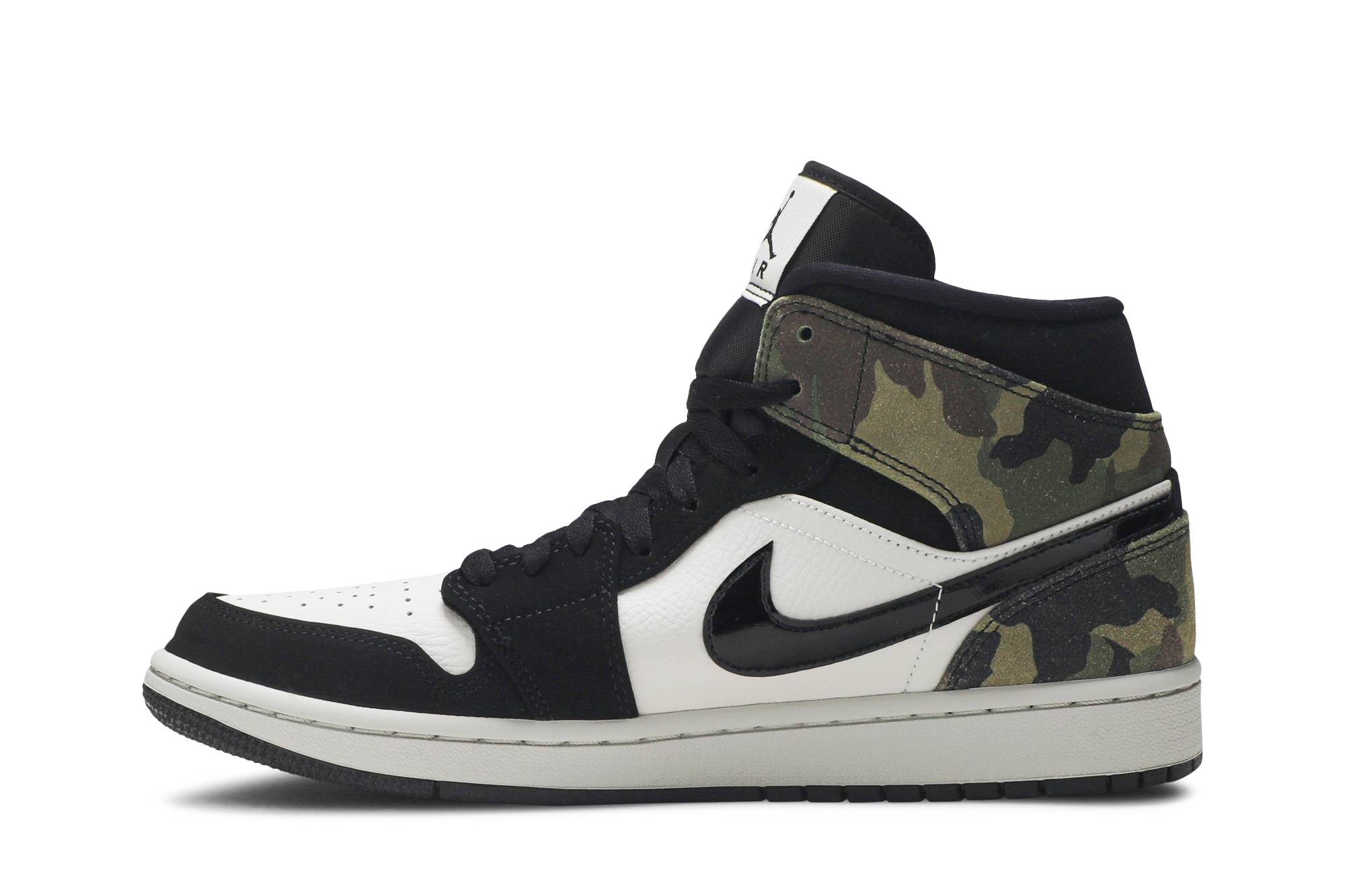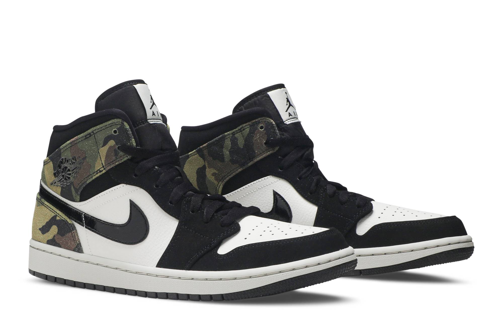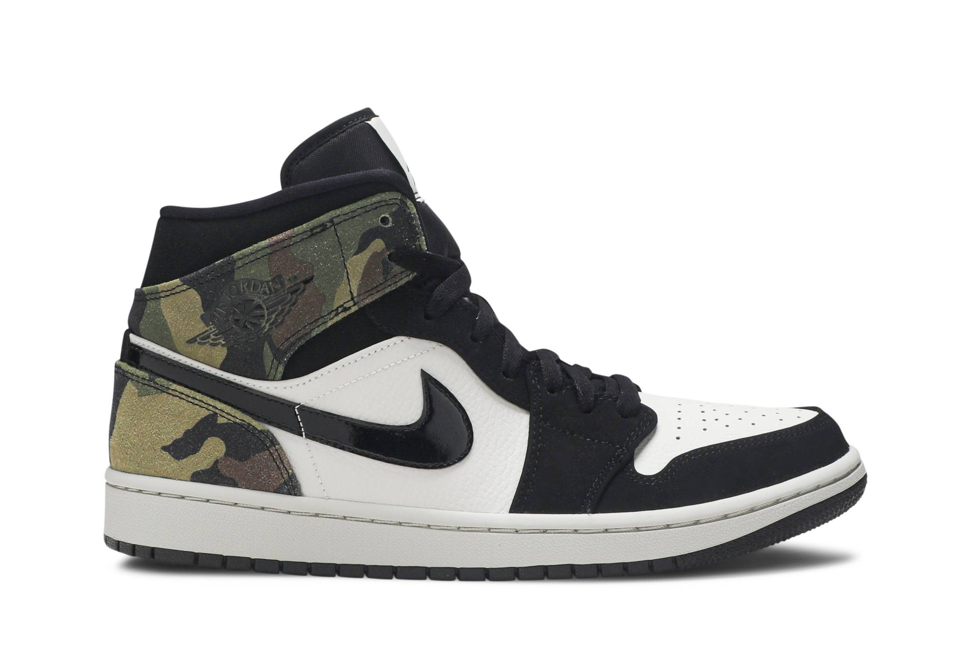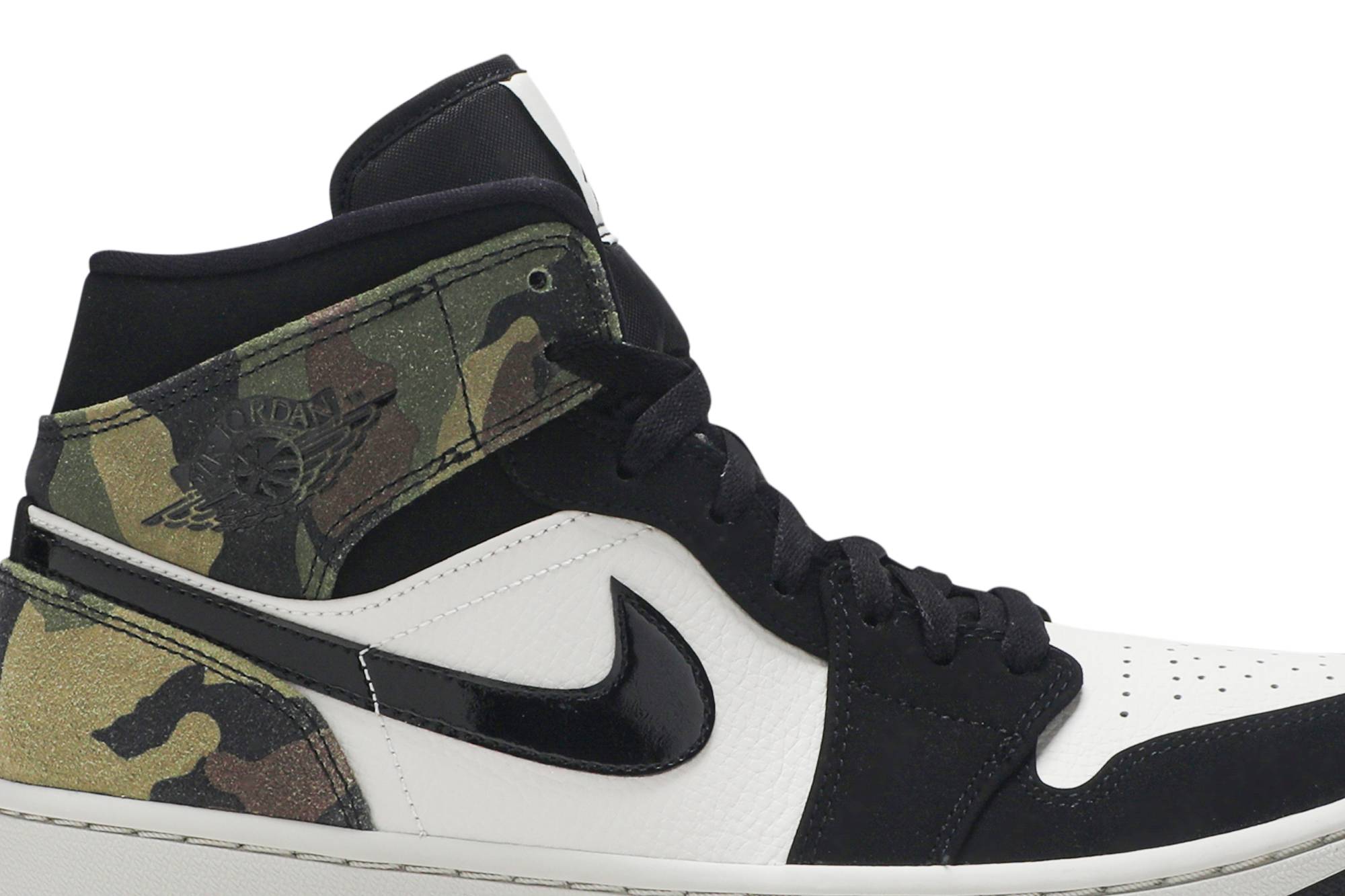 Introducing the Air Jordan 1 Mid Camo sneakers from the iconic brand Jordan. These stylish kicks feature a sleek black colorway with a striking camouflage pattern, making them a must-have for any sneakerhead. Step up your shoe game with the Air Jordan 1 Mid Camo, the perfect blend of style and performance.