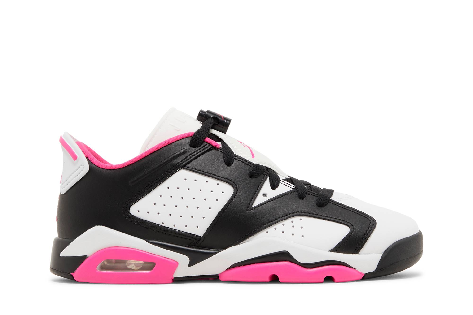 Introducing the Grade School Air Jordan 6 Low ‘Fierce Pink’ (768878-061), perfect for young sneaker enthusiasts. This bold design features a sleek black leather upper contrasted with vibrant fierce pink accents and midsole. The iconic perforated detailing and signature Jumpman logo ensure timeless style and breathable comfort. Completed with an icy translucent outsole, these shoes not only offer superior traction but also elevate any outfit. Step up your game in unparalleled style with the Air Jordan 6 Low ‘Fier