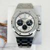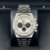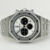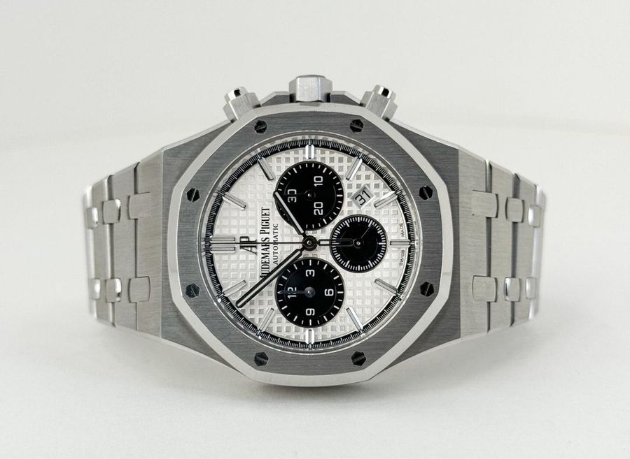 The Audemars Piguet Royal Oak Chronograph 41mm Ref 26331ST, known as the “Panda,” is an elegant and sporty timepiece. It features a 41mm stainless steel case and bracelet, providing durability and a sophisticated look. The white dial with contrasting black subdials (hence the “Panda” nickname) is adorned with the signature “Grande Tapisserie” pattern, offering a striking visual appeal. Powered by the self-winding Calibre 2385, it ensures precise timekeeping with a power reserve of approximately 40 hours.