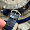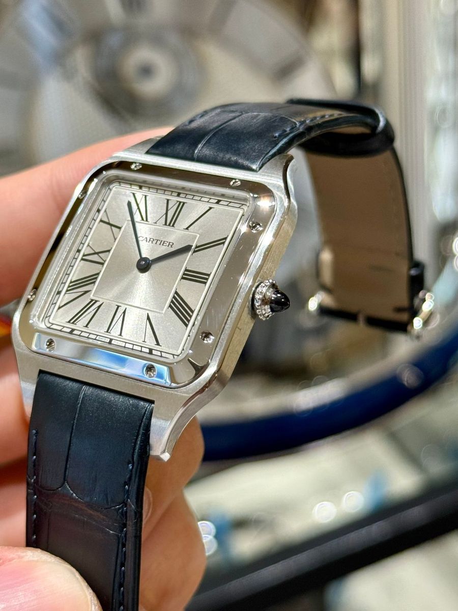 This Cartier Santos-Dumont Extra-Large Model combines timeless design with modern craftsmanship. The use of stainless steel provides durability and a contemporary edge, while the hand-wound mechanical movement showcases Cartier’s commitment to traditional watchmaking techniques. The elegant black leather strap and the distinctive blue spinel crown add to its classic appeal, making this watch a sophisticated choice for those who appreciate both form and function in their timepieces.