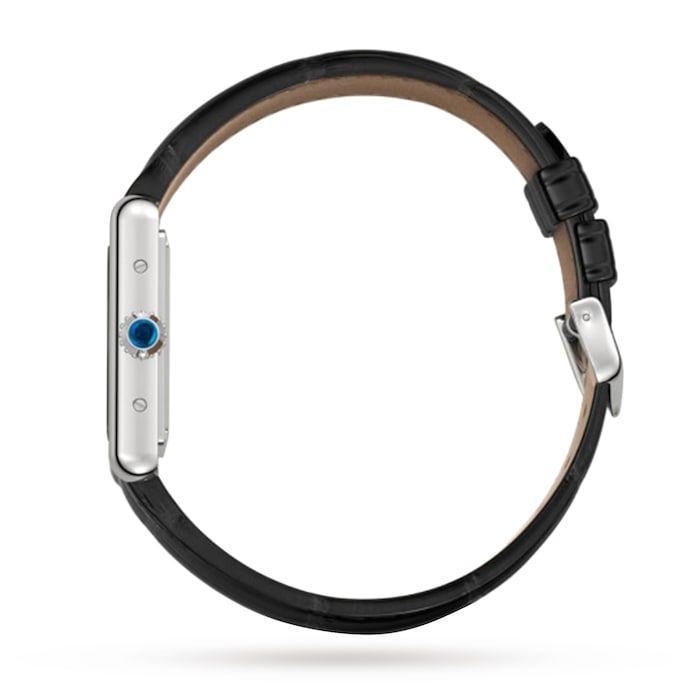 Dial: Silvered opaline dial with Roman numeral hour markers and blue sword-shaped hands, exuding classic Cartier sophistication