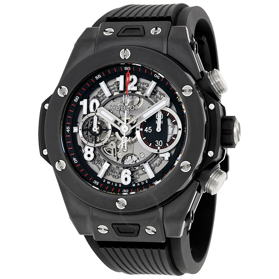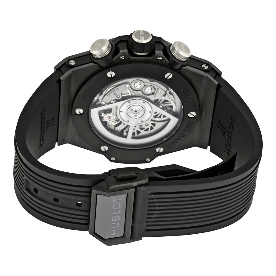 Microblasted black ceramic case with a black rubber strap. Fixed black ceramic bezel. Black skeleton dial with rhodium hands and alternating index and Arabic numeral hour markers. Minute markers around the outer rim. Dial Type: Analog. Date display at the 3 o’clock position. Chronograph – two sub-dials displaying: 60 second and 30 minute. Hublot calibre HUB1242 Unico automatic movement with a 72-hour power reserve. Scratch resistant sapphire crystal. Screw down crown. Transparent case back. Case size: 45 mm. Case thickness: 15.85 mm. Round case shape. Strap width: 20 mm. Deployment clasp with a push button release. Water resistant at 100 meters / 330 feet. Functions: chronograph, date, hour, minute, second. Luxury watch style. Watch label: Swiss Made. Hublot Big Bang Automatic Men’s Chronograph Watch 411.CI.1170.RX.