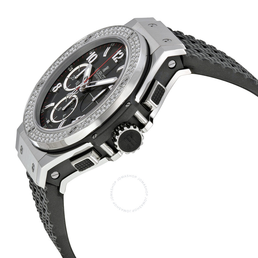 Stainless steel case with a black rubber (gummy) strap. Fixed stainless steel bezel set with diamond and featuring screw down accents. Black dial with luminous hands and alternating Arabic numeral and index hour markers. Minute markers around the outer rim. Dial Type: Analog. Luminescent hands and markers. Date display between the 4 and 5 o’clock positions. Chronograph – three sub-dials displaying: 60 second, 30 minute and 12 hour. Hublot calibre HUB2894 automatic movement with a 42-hour power reserve. Scratch resistant sapphire crystal. Pull / push crown. Skeleton case back. Case size: 41 mm. Case thickness: 14mm. Round case shape. Band width: 24 mm. Band length: 8 inches. Deployment clasp. Water resistant at 100 meters / 330 feet. Functions: chronograph, date, hour, minute, second. Luxury watch style. Watch label: Swiss Made. Item Variations: 341SX130RX114. Hublot Big Bang Black Dial Black Rubber Men’s Watch 341.SX.130.RX.114.