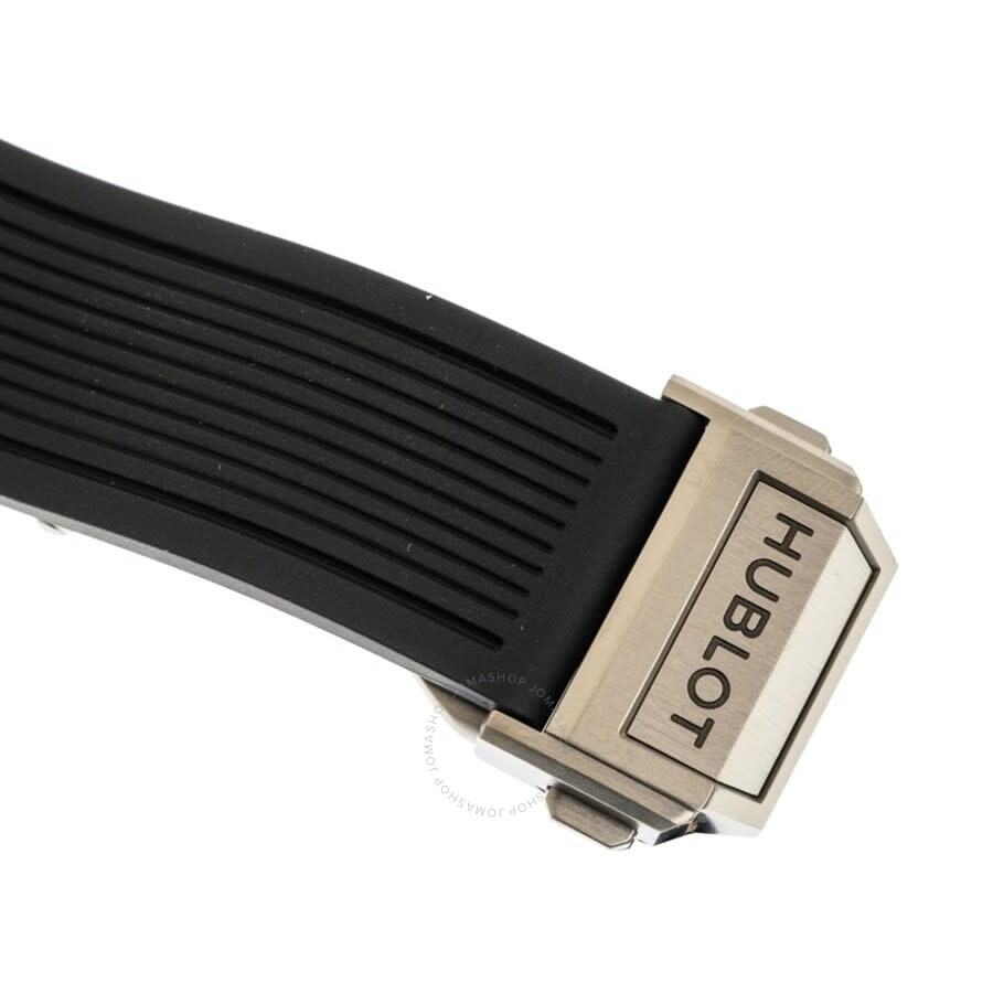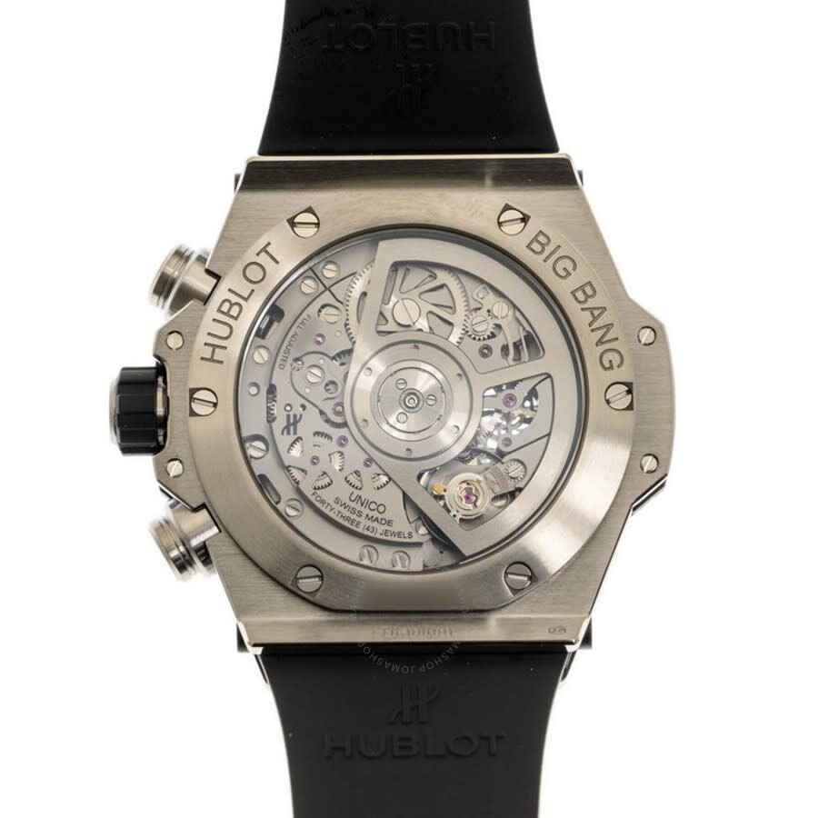 Grey titanium case with a black rubber strap. Fixed grey titanium bezel. Skeleton dial with luminous silver-tone hands and alternating index and Arabic numeral hour markers. Arabic numeral minute markers (at 5 minute intervals). Minute markers around the outer rim. Dial Type: Analog. Luminescent hands and markers. Date display at the 3 o’clock position. Chronograph – two sub-dials displaying: 60 minute and 60 second. Hublot calibre HUB1280 automatic movement, containing 43 Jewels, composed of 354 parts, bitting at 28800 vph, and has a power reserve of approximately 72 hours. Scratch resistant sapphire crystal. Screw down crown. Transparent case back. Round case shape. Case size: 42 mm. Water resistant at 100 meters / 330 feet. Functions: chronograph, date, hour, minute, second. Additional Info: original box, manual (complete accessories). Big Bang Series. Luxury watch style. Watch label: Swiss Made. Hublot Big Bang Chronograph Automatic Men’s Watch 441.NX.1171.RX.