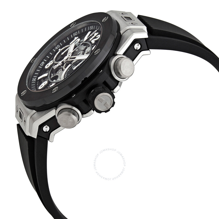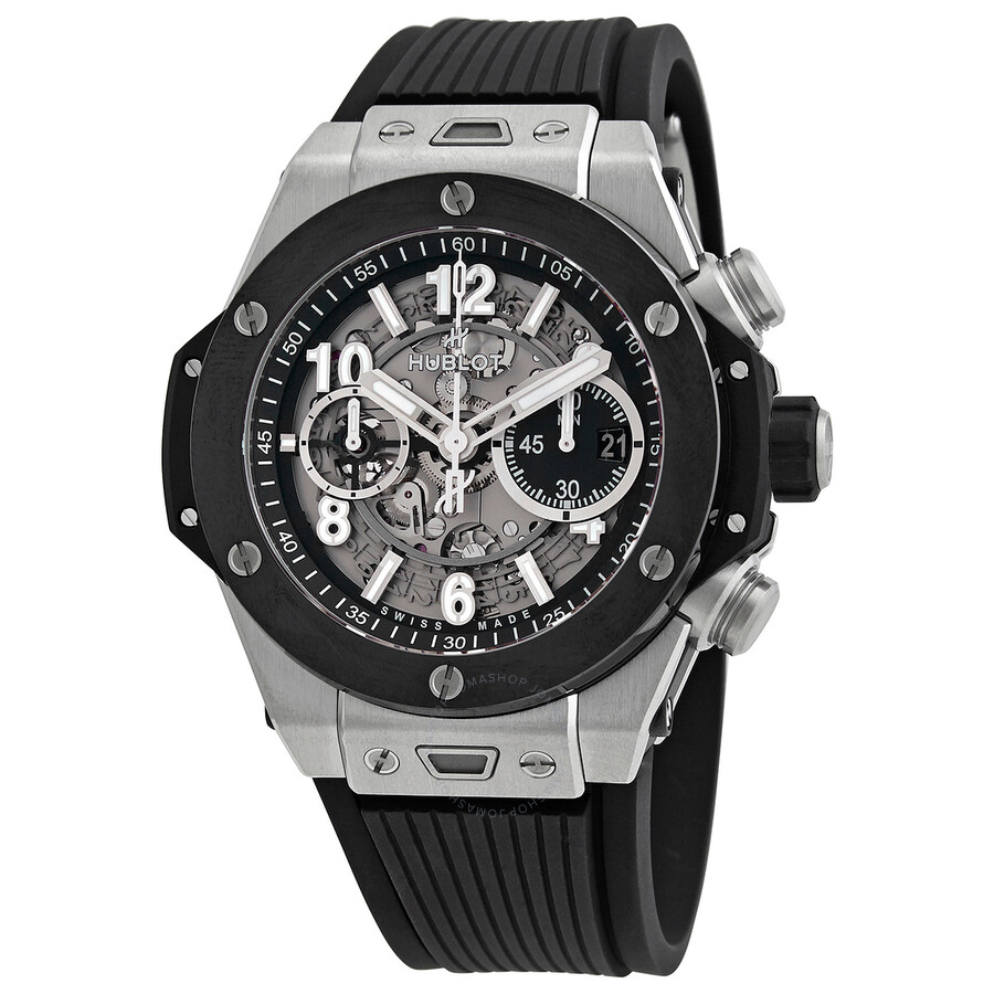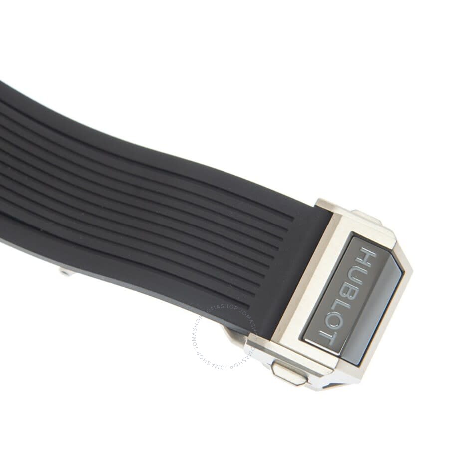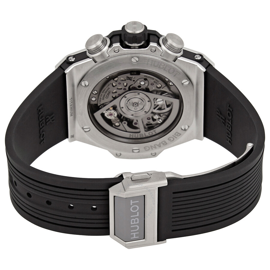 Grey titanium case with a black rubber strap. Fixed black ceramic bezel. Transparent dial with silver-tone hands and Arabic numeral hour markers. Arabic numeral minute markers (at 5 minute intervals). Minute markers around the outer rim. Dial Type: Analog. Luminescent hands and markers. Date display at the 3 o’clock position. Chronograph – two sub-dials displaying: 60 minute and 60 second. Hublot calibre HUB1280 automatic movement, containing 43 Jewels, composed of 354 parts, bitting at 28800 vph, and has a power reserve of approximately 72 hours. Scratch resistant sapphire crystal. Screw down crown. Transparent case back. Round case shape. Case size: 44 mm. Deployment clasp with a push button release. Water resistant at 100 meters / 330 feet. Functions: chronograph, column wheel, hour, minute, second. Additional Info: original box, international warranty card, manual (complete accessories). Big Bang Series. Luxury watch style. Watch label: Swiss Made. Hublot Big Bang Chronograph Automatic Men’s Watch 421.NM.1170.RX.