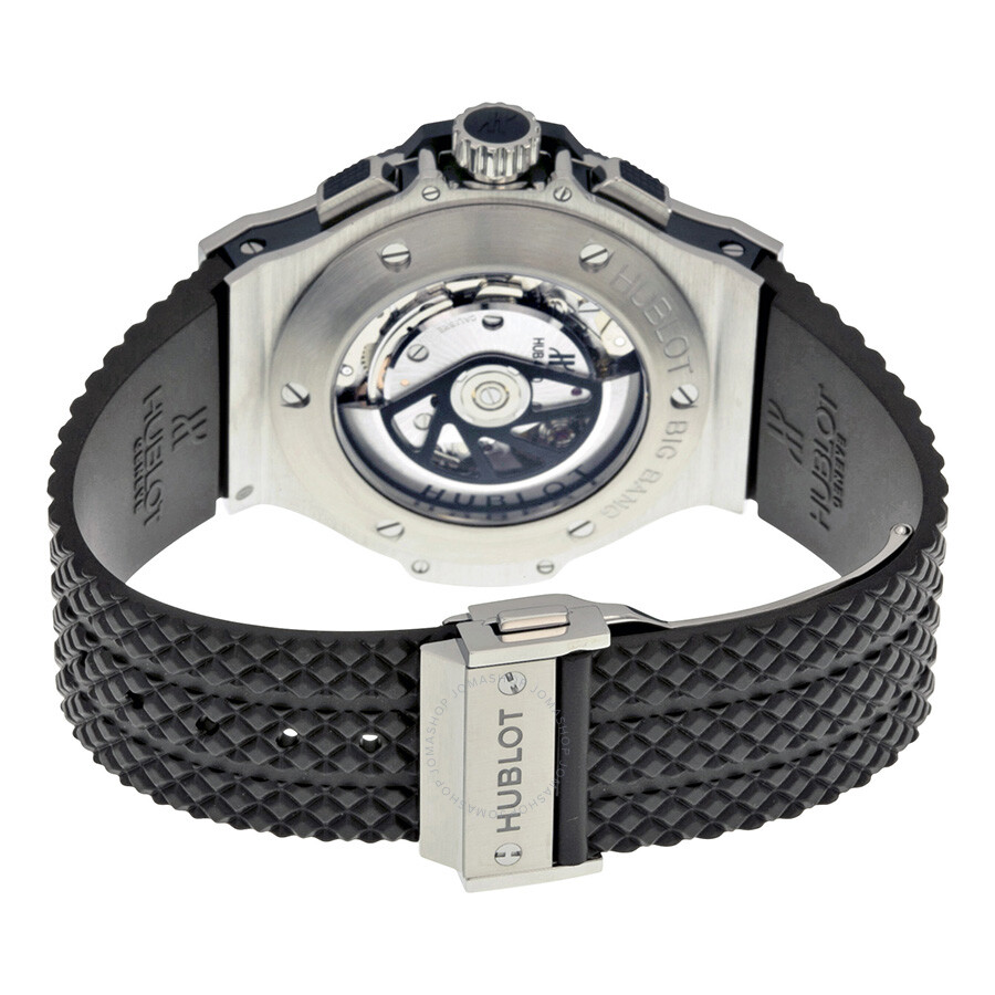 Stainless steel case with lateral black Kevlar inserts and a black rubber strap. Fixed black ceramic bezel. Black carbon fiber pattern dial with luminous skeleton hands and alternating Arabic numeral and index hour markers. Minute markers around the outer rim. Dial Type: Analog. Luminescent hands and markers. Date display between the 4 and 5 o’clock positions. Chronograph – three sub-dials displaying: 60 second, 30 minute and 12 hour. Hublot calibre HUB4100 automatic movement, based upon ETA 2894-2, containing 27 Jewels, composed of 252 parts, bitting at 28800 vph, and has a power reserve of approximately 42 hours. Scratch resistant sapphire crystal. Pull / push crown. Transparent case back. Round case shape. Case size: 44 mm. Case thickness: 14.5 mm. Band width: 25 mm. Band length: 8 inches. Fold over clasp with a push button release. Water resistant at 100 meters / 330 feet. Functions: chronograph, date, hour, minute, second. Sport watch style. Watch label: Swiss Made. Item Variations: 301.SB.131.RX, 301-SB-131-RX, 301/SB/131/RX, 301SB131RX. Hublot Big Bang Steel Ceramic Men’s Watch 301.SB.131.RX.