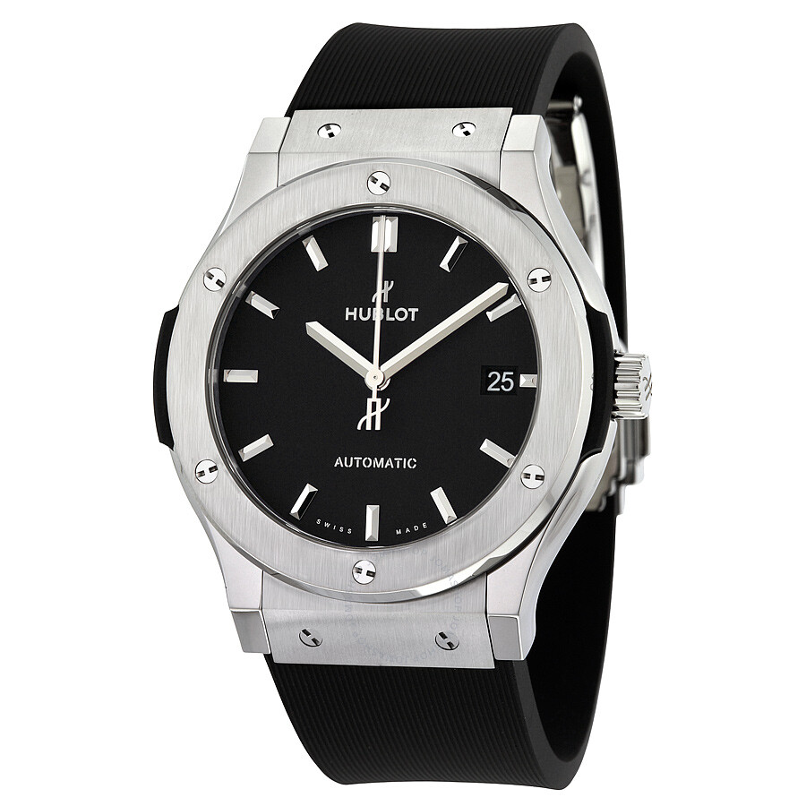 Titanium case with a black rubber strap. Fixed titanium bezel. Black composite resin bezel lug sandwiched between the bezel and case. Black dial with silver-tone hands and index hour markers. Dial Type: Analog. Date display at the 3 o’clock position. Hublot calibre HUB1112 automatic movement, based upon Sellita SW300-1, containing 25 Jewels, composed of 63 parts, bitting at 28800 vph, and has a power reserve of approximately 42 hours. Scratch resistant sapphire crystal. Screw down crown. Skeleton case back. Round case shape. Case size: 42 mm. Fold over clasp with a push button release. Water resistant at 50 meters / 165 feet. Functions: date, hour, minute, second. Classic Fusion Series. Luxury watch style. Watch label: Swiss Made. Item Variations: 511NX1171RX. Hublot Classic Fusion Automatic Black Dial Black Rubber Men’s 45mm Watch 511.NX.1171.RX.