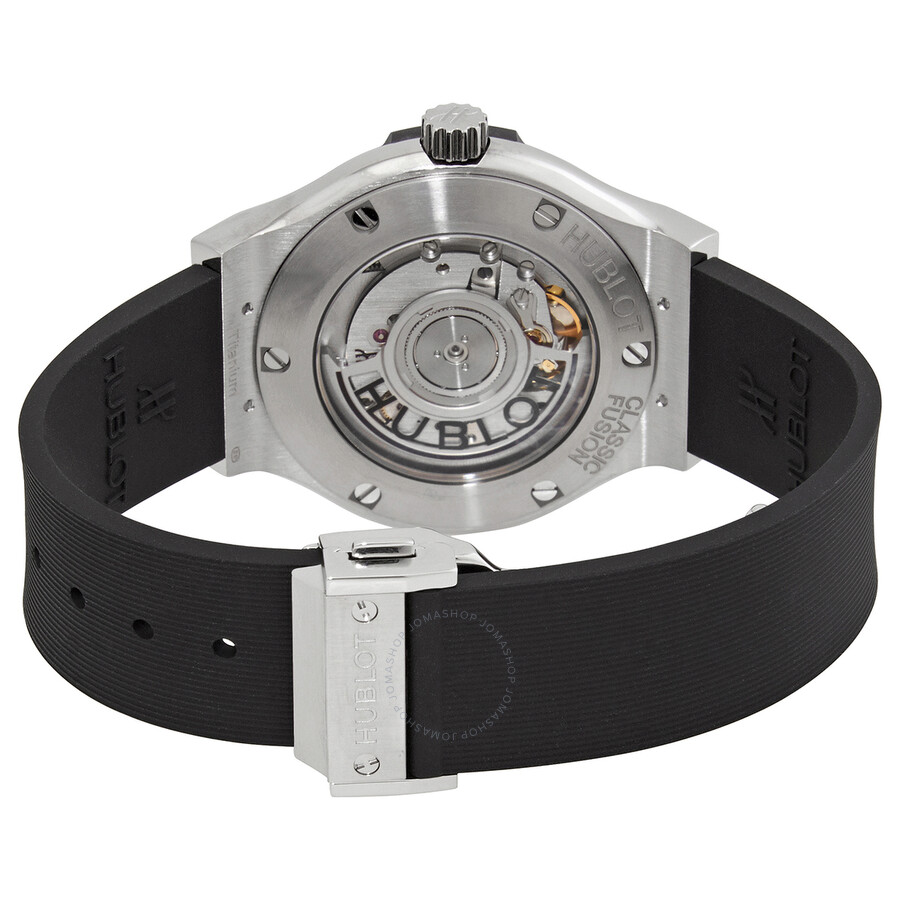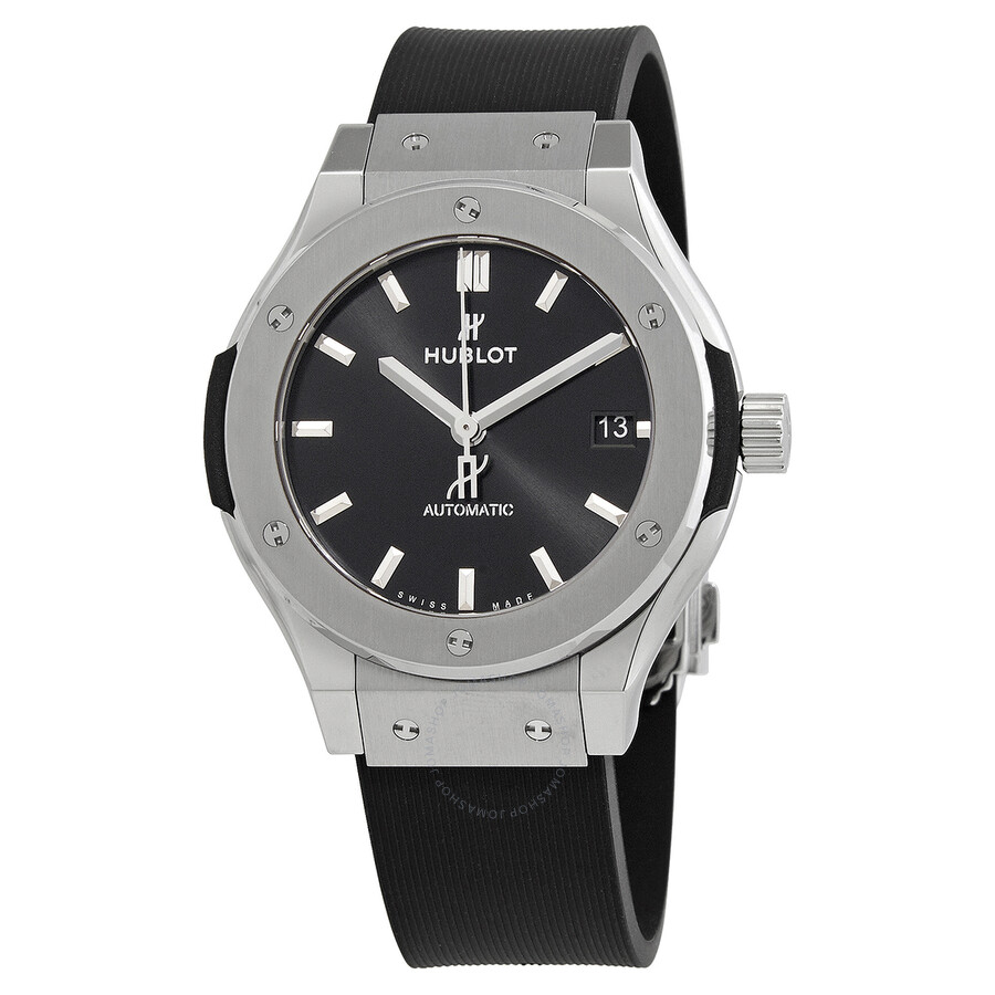Grey titanium case with a black rubber strap. Fixed grey titanium bezel. Black dial with silver-tone hands and index hour markers. Dial Type: Analog. Date display at the 3 o’clock position. Hublot calibre HUB1110 automatic movement, based upon Sellita SW300-1, containing 21 Jewels, composed of 63 parts, bitting at 28800 vph, and has a power reserve of approximately 42 hours. Scratch resistant sapphire crystal. Pull / push crown. Transparent case back. Round case shape. Case size: 38 mm. Case thickness: 9 mm. Deployment clasp. Water resistant at 50 meters / 165 feet. Functions: date, hour, minute, second. Additional Info: original box, manual (complete accessories). Classic Fusion Series. Luxury watch style. Watch label: Swiss Made. Hublot Classic Fusion Automatic Black Dial Watch 565.NX.1470.RX.