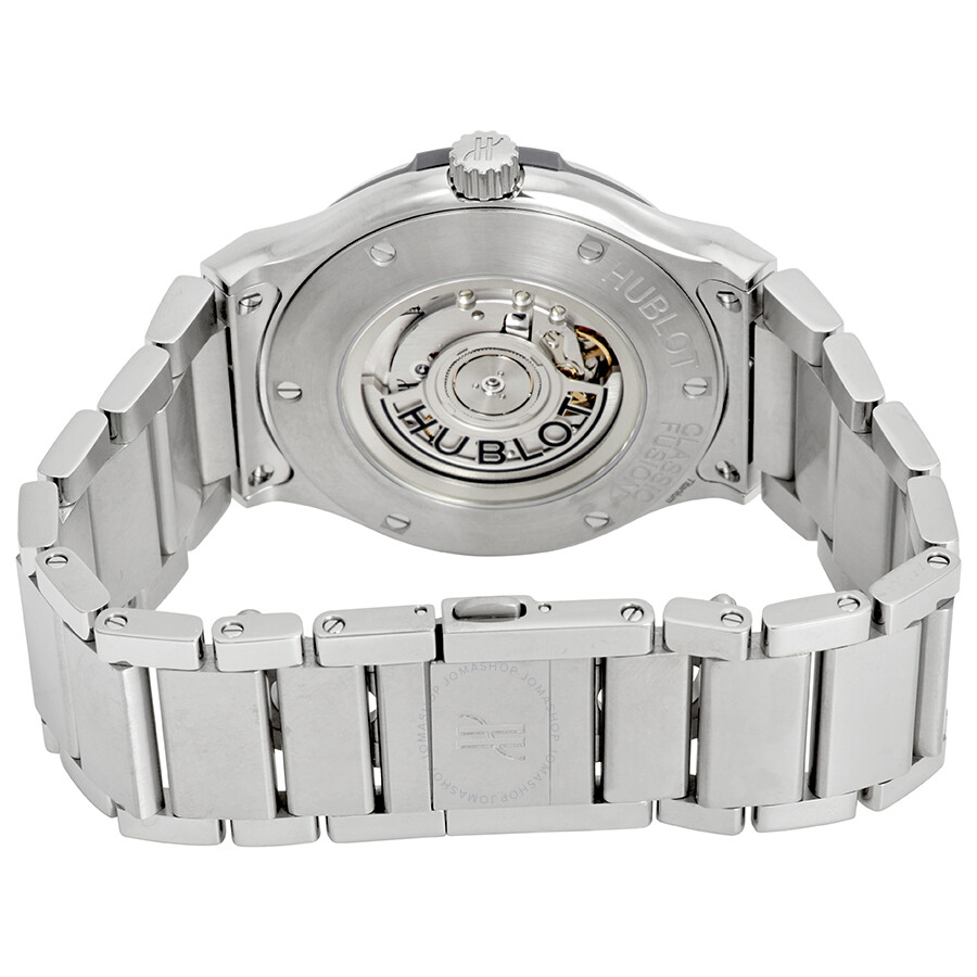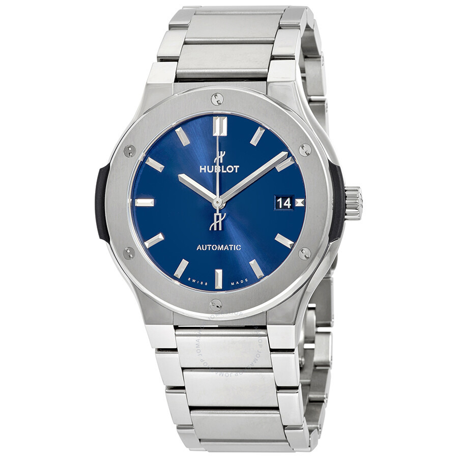 Grey titanium case with a grey titanium bracelet. Fixed grey titanium bezel. Blue dial with grey hands and index hour markers. Dial Type: Analog. Date display at the 3 o’clock position. Hublot calibre HUB1112 automatic movement, based upon Sellita SW300-1, containing 25 Jewels, composed of 63 parts, bitting at 28800 vph, and has a power reserve of approximately 42 hours. Scratch resistant sapphire crystal. Pull / push crown. Transparent case back. Round case shape. Case size: 45 mm. Fold over clasp with a push button release. Water resistant at 50 meters / 165 feet. Functions: date, hour, minute, second. Classic Fusion Series. Luxury watch style. Watch label: Swiss Made. Hublot Classic Fusion Automatic Blue Dial Men’s Watch 510.NX.7170.NX.