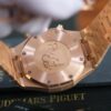 Bezel: Fixed 18K rose gold bezel with the signature octagonal shape, polished chamfers, and hexagonal screws, a defining characteristic of the Royal Oak collection.