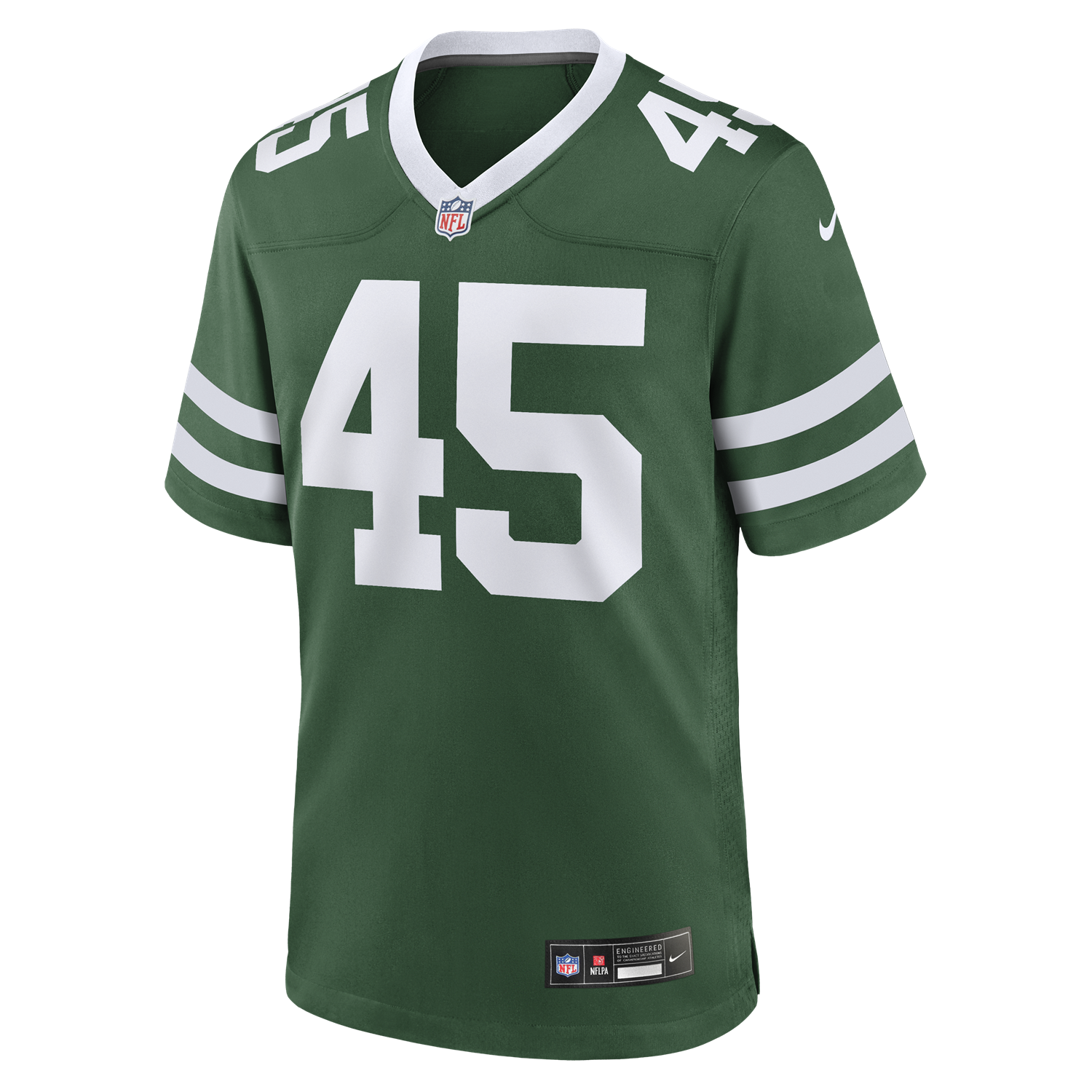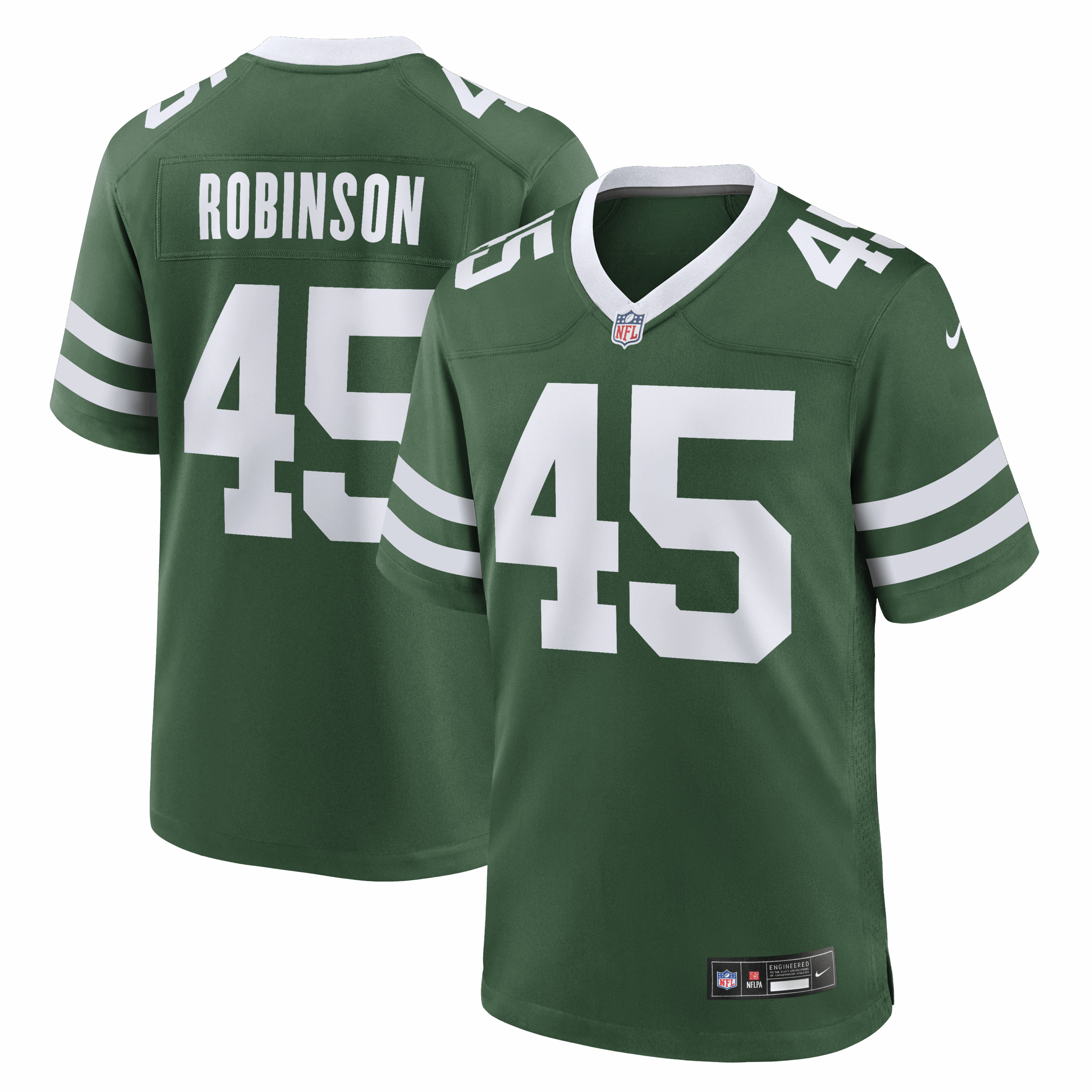 This Mark Robinson Nike Game Jersey is an essential piece of gear for any New York Jets fan looking to highlight their favorite player. The heat-sealed name, number and team details provide a kickoff-ready look that elevates your excitement for game day. Made with comfort in mind, this New York Jets Team replica jersey delivers a standard, lightweight fit and features breathable mesh side panels for added ventilation.
