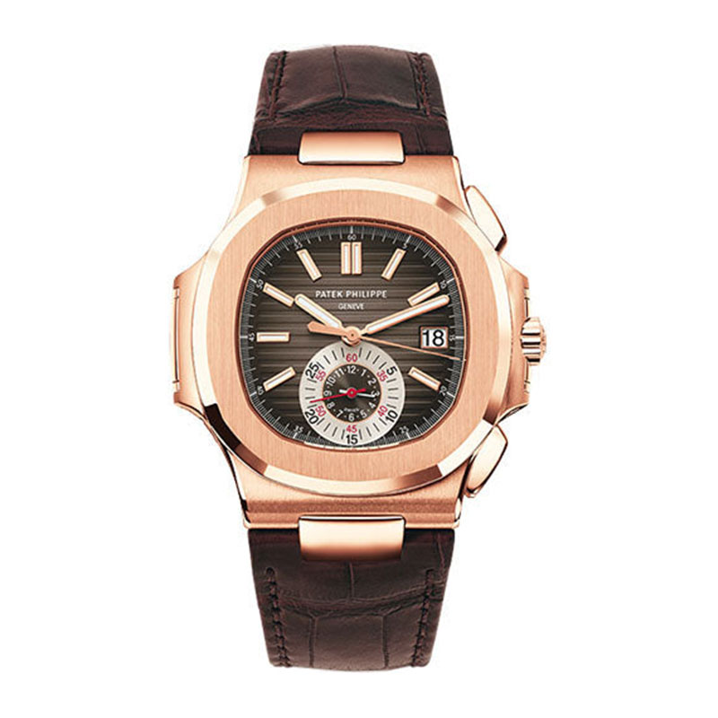 40.5mm 18K rose gold case, sapphire crystal back, screw-down crown, black-brown dial with gold applied hour markers with luminescent coating, self winding caliber CH 28-520 C movement with 60-minute and 12-hour monocounter chronograph and date, approximately 55 hour of power reserve, matt dark brown alligator strap with Nautilus fold-over buckle. Water resistant to 120 meters.