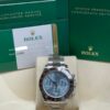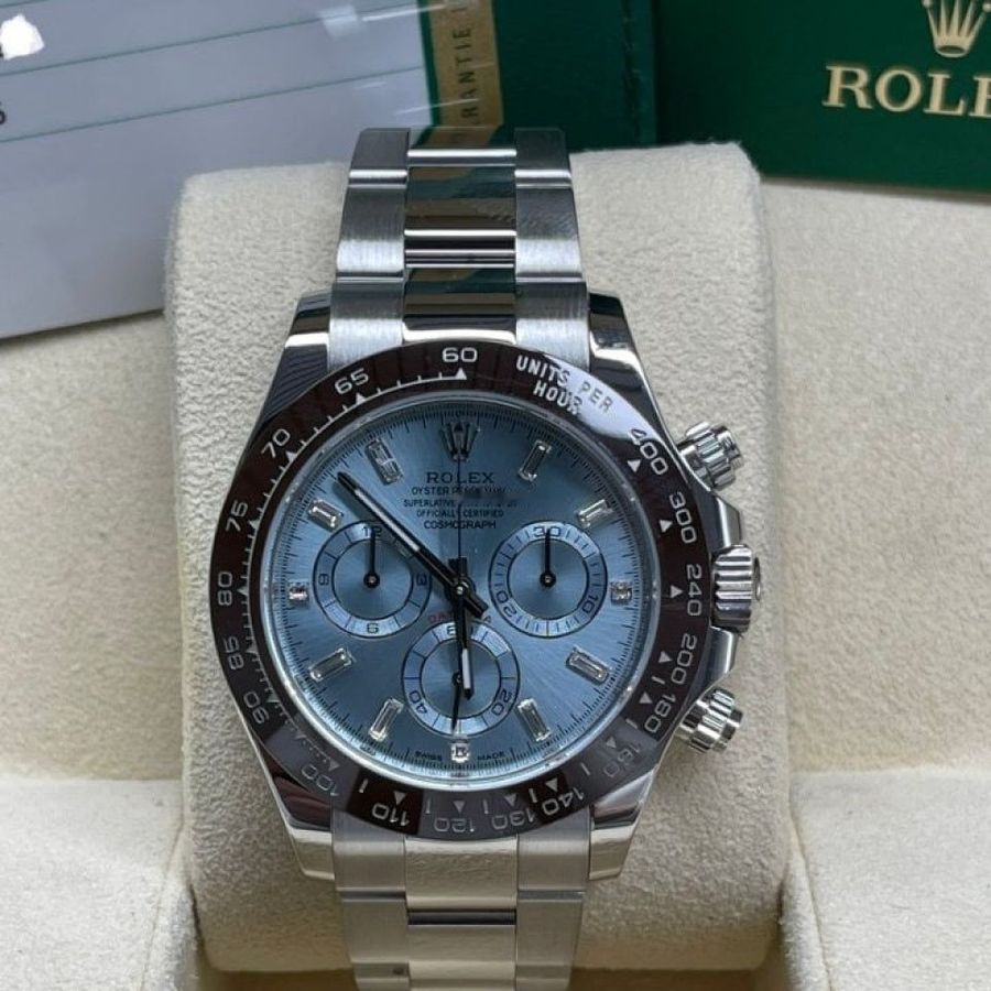The Rolex Cosmograph Daytona 116506 is an exquisite timepiece that epitomizes luxury and precision. Crafted from platinum, this 40mm watch features an ice blue dial with chestnut brown subdials, offering a striking contrast. The watch is powered by the Rolex Calibre 4130, a high-performance chronograph movement ensuring accurate timekeeping and a power reserve of approximately 72 hours. The platinum Oyster bracelet provides durability and a refined look, with an Oysterlock safety clasp for secure wear.
