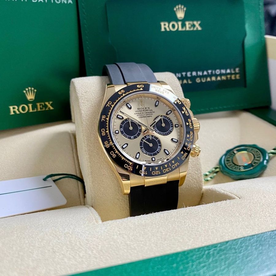 The Rolex Cosmograph Daytona 116518LN is a luxurious and high-performance timepiece, designed for those who appreciate both style and precision. Crafted from 18K yellow gold, it features a sophisticated champagne dial with black subdials and Chromalight hands and hour markers for enhanced legibility. The 40mm case is complemented by a black Cerachrom bezel with a tachymetric scale, ideal for measuring speeds. The Oysterflex bracelet combines the robustness of metal with the flexibility of elastomer, ensuring comfort and durability.