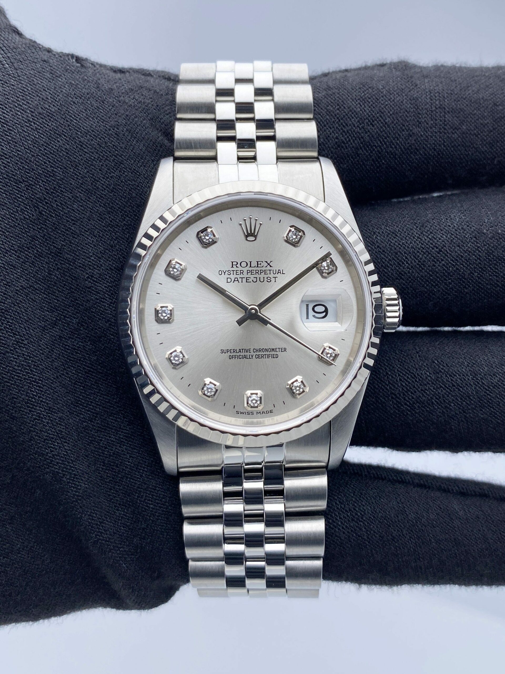 36mm stainless steel case with 18K white gold fluted bezel.??Silver??dial with silver??hands??and original factory diamond set??hour markers
