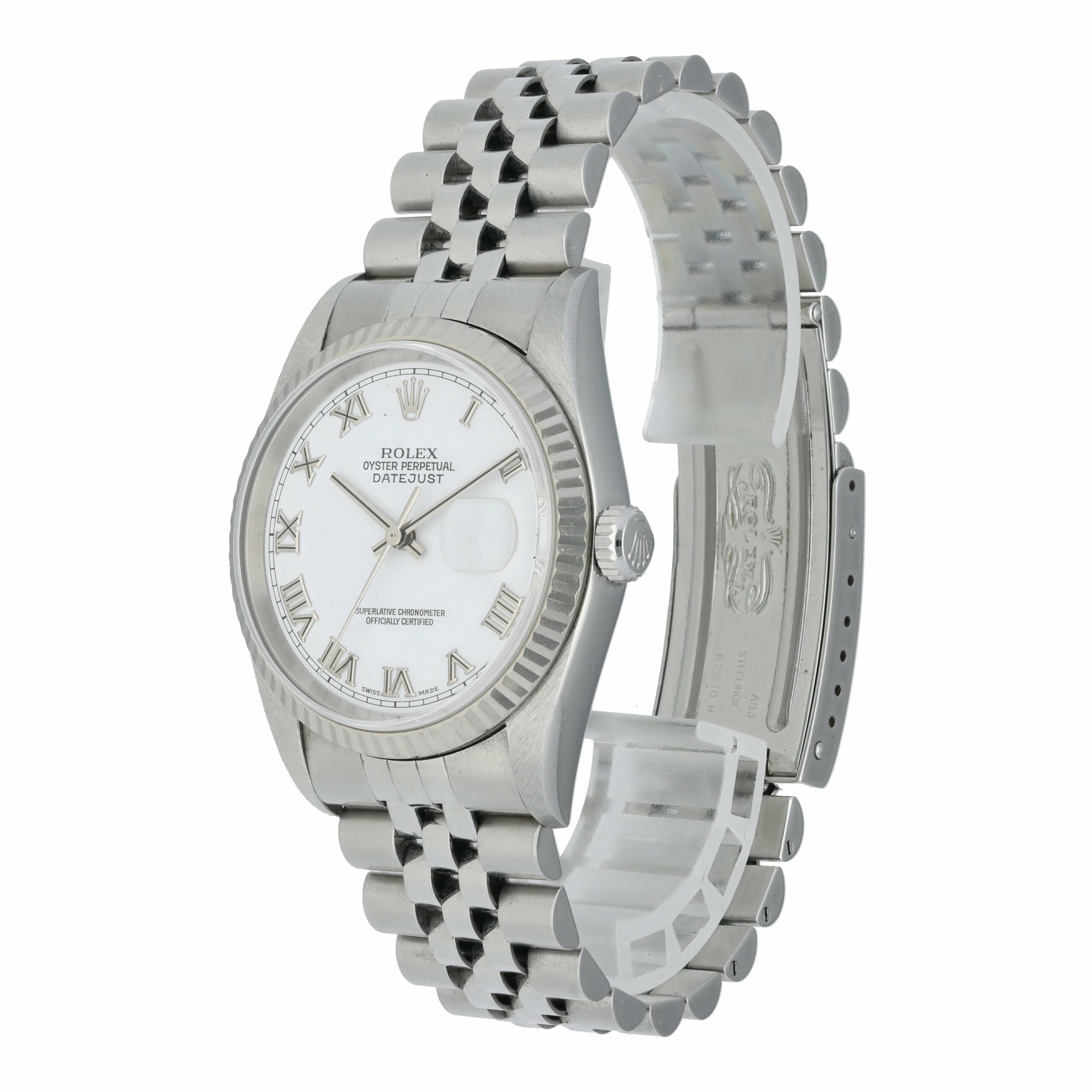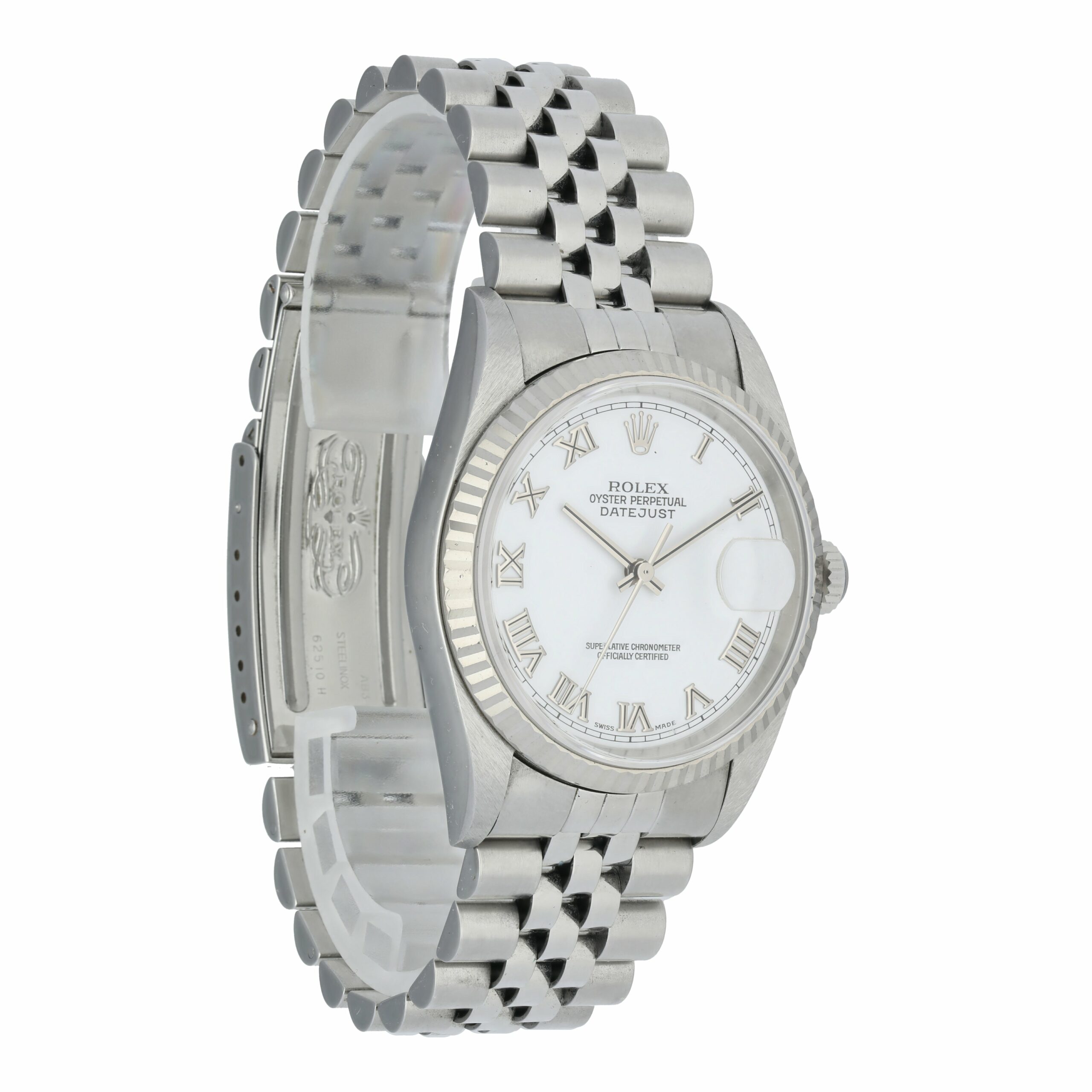 White dial with steel hands and Roman numeral hour markers.