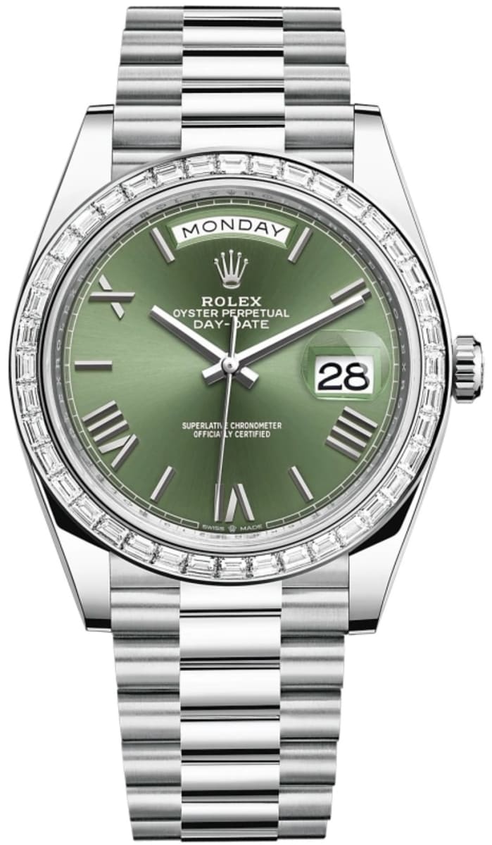 Brand New Rolex Day-Date 40 Platinum Olive Green Dial Diamond Bezel Men’s Watch Model M228396TBR-0020