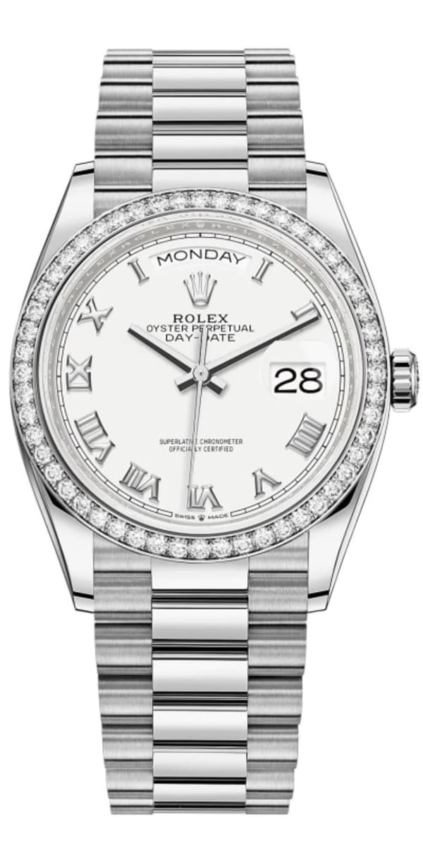 Brand New Rolex Day-Date White Gold White Roman Dial Diamond Bezel Women’s Luxury Watch Model M128349RBR-0025