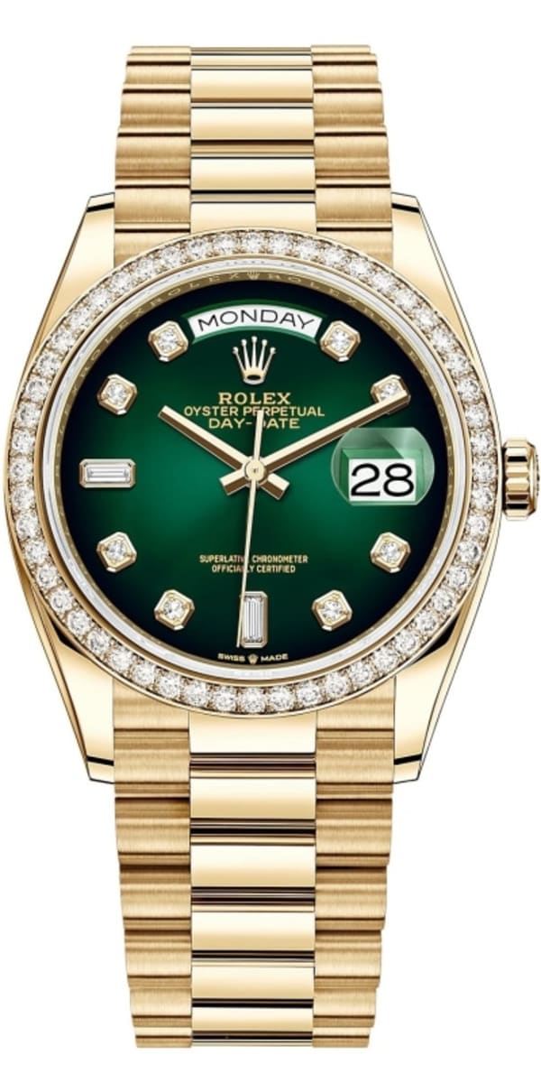 Dial description: Polished Yellow Gold Hands and Diamond Hour Markers With the Day and Date Displayed, on a Green Ombre Dial