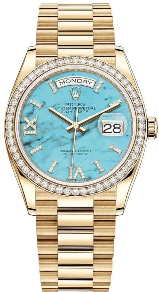 Brand New Rolex Day-Date Yellow Gold Turquoise Diamond-Set Roman Dial Diamond Bezel Women’s Luxury Watch Model M128348RBR-0037