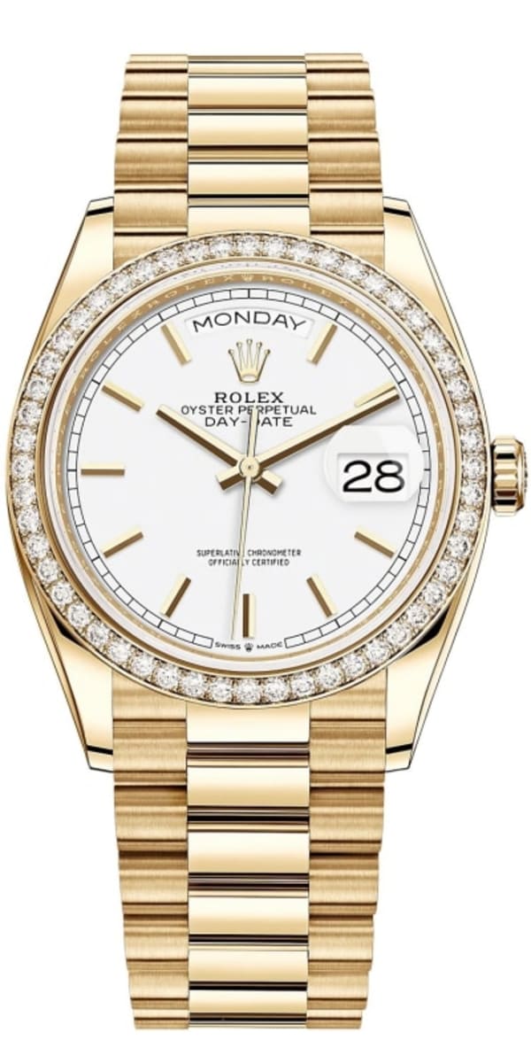 Brand New Rolex Day-Date Yellow Gold White Dial Diamond Bezel Women’s Luxury Watch Model M128348RBR-0047