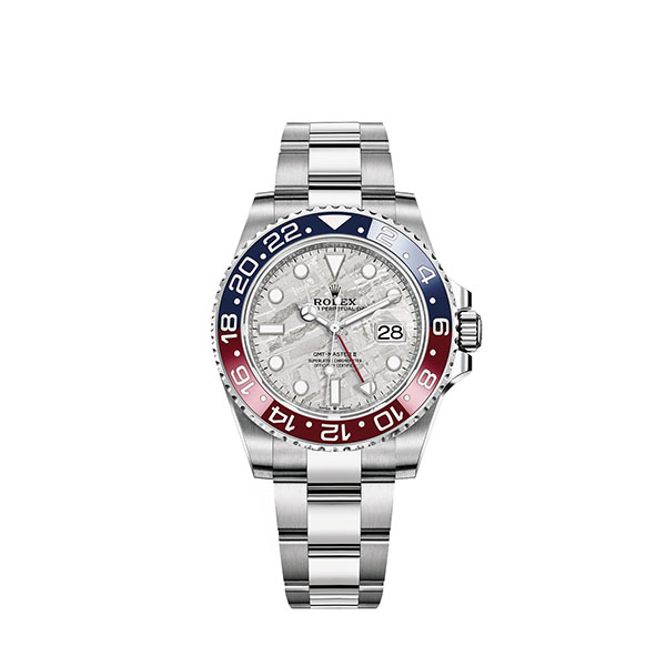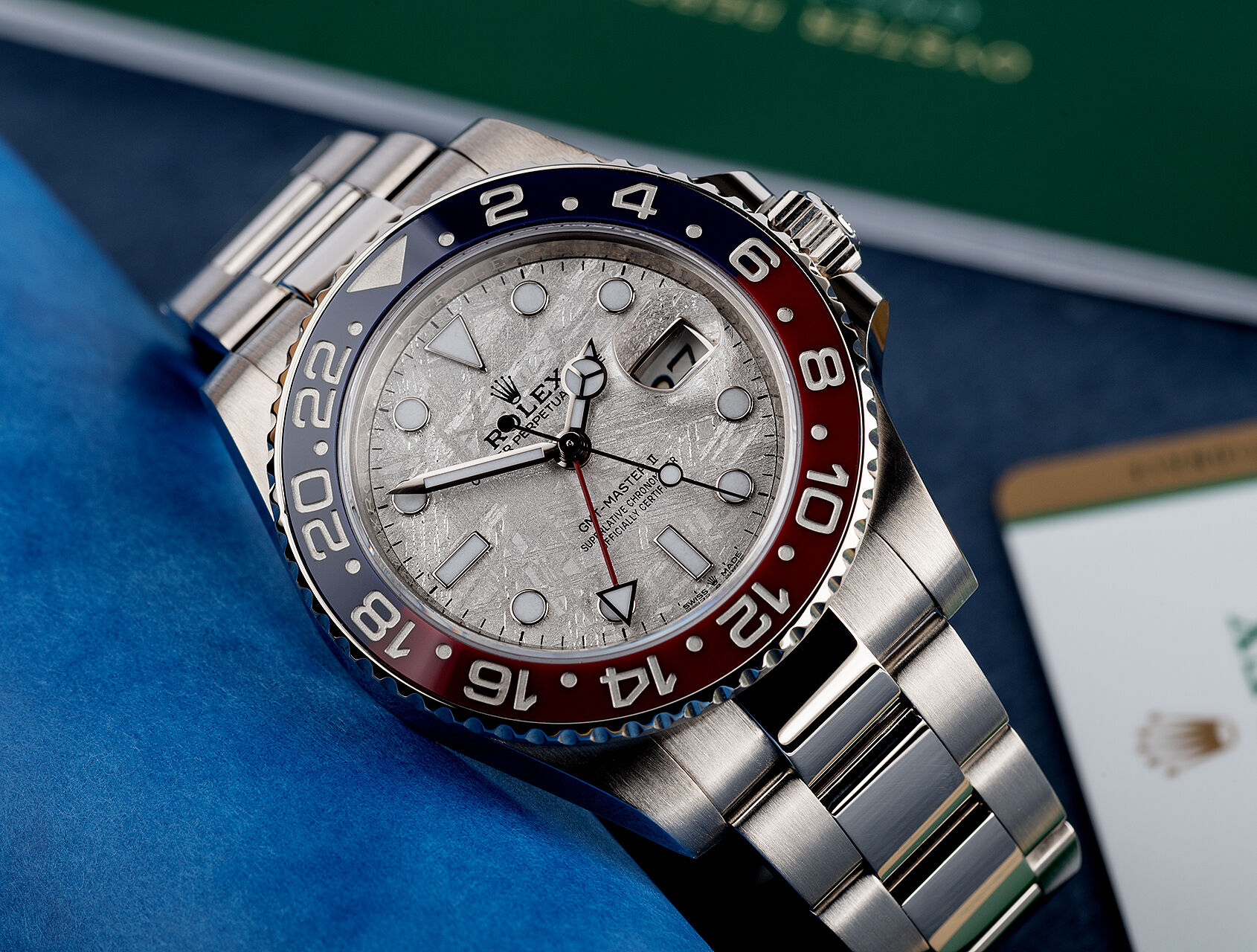 This model features a meteorite dial and a two-colour Cerachrom bezel insert in red and blue ceramic